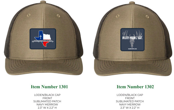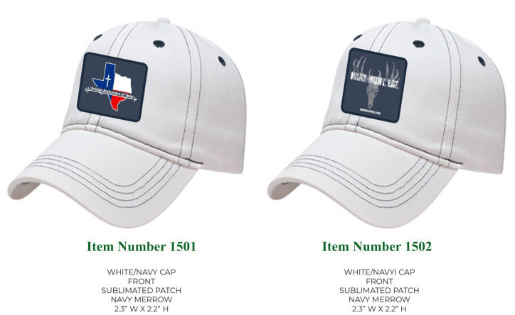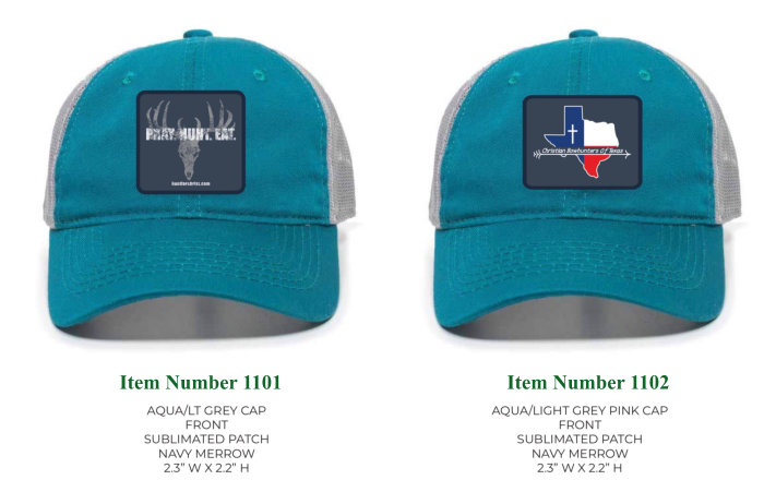 • Prices:Hats are are $25 each or two for $40 you mix and match. Also if you just want a patch of either design they are $5 each.